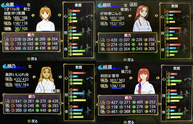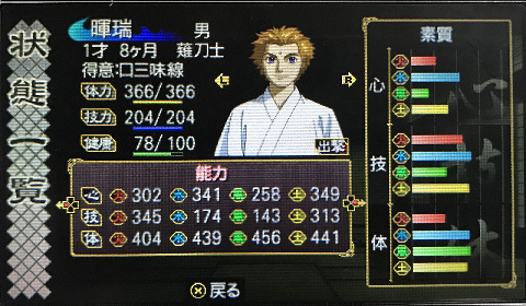 出陣中は暉瑞が前列張ってくれていたんだよね。 女の子たちより体力も防御もあったから。技風は低いのに、体力だけで出してしまった。 今なら色々なプレイ記を拝見して知識もあるから、何かしら考えたり、防御させたと思うんですよ。
